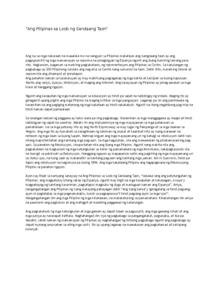 Page Flip View. 2952021 Ang pilipinas sa loob ng sandaang taon isang sanaysay i. Ang magpatuloy bilang sakop ng Espanya ngunit may higit na mga karapatan at kaluwagan o kayay magpahayag ng kanilang kasarinlan pagkatapos magbubo ng dugo at maduguan naman ang Espanya.