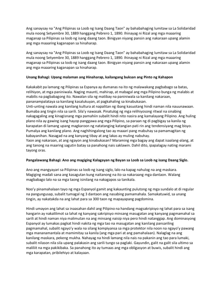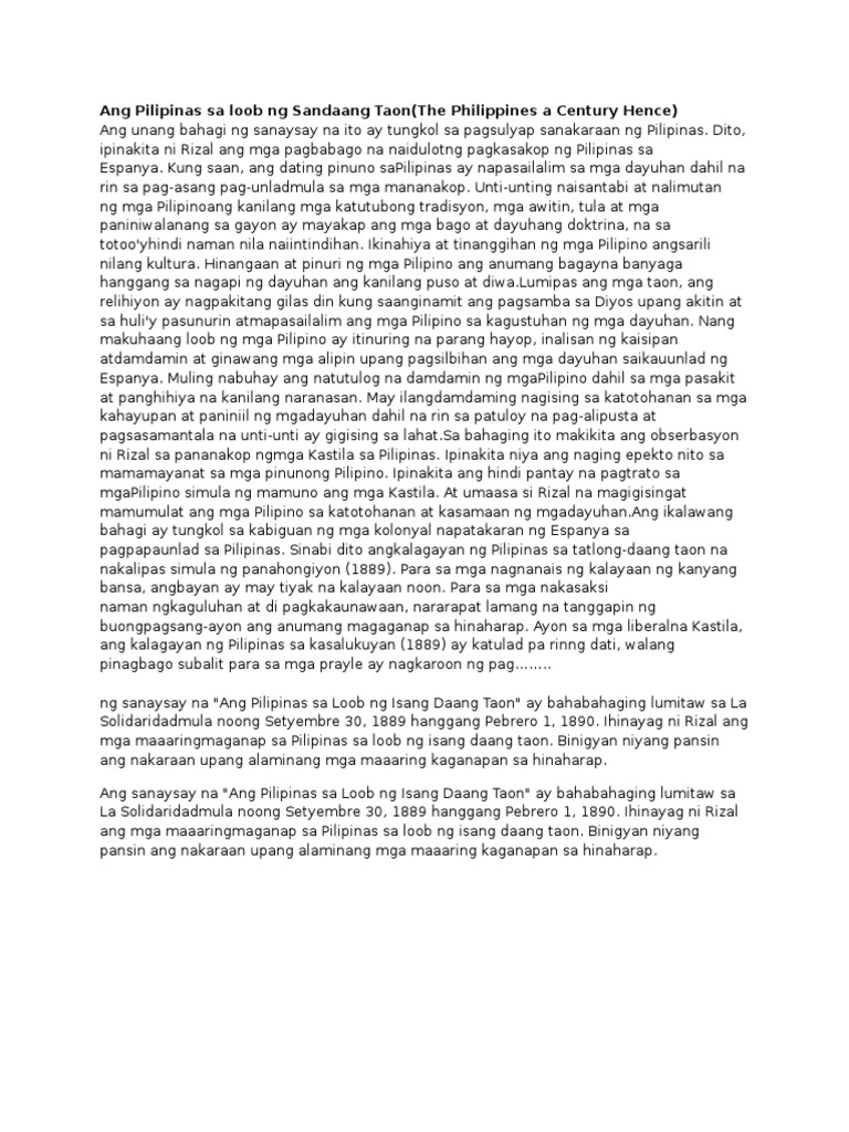 2892011 Ang Pilipinas sa Loob ng Sandaang Taon ulliAng mga kahilingan ng Pilipino ay nararapat lamang na ikonsidera ng Espanya kung ayaw niyang isubo sa panganib ang kanyang. Jose Rizal na may orihinal na pamagat na Filipinas dentro de cien anos ito ay unang nalimbag sa pahayagang La Silidaridad sa Madrid Espanya noong Septiyembre 30. Ayon kay Rizal sa kaniyang sanaysay na Ang Pilipinas sa Loob ng Sandaang Taon dalawa lang ang patutunguhan ng Pilipinas.