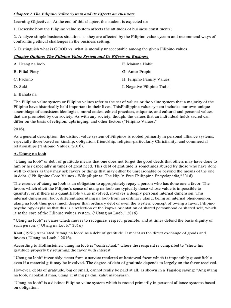 Chapter 7 The Filipino Value System And Its Effects On Business Social Institutions Social Science